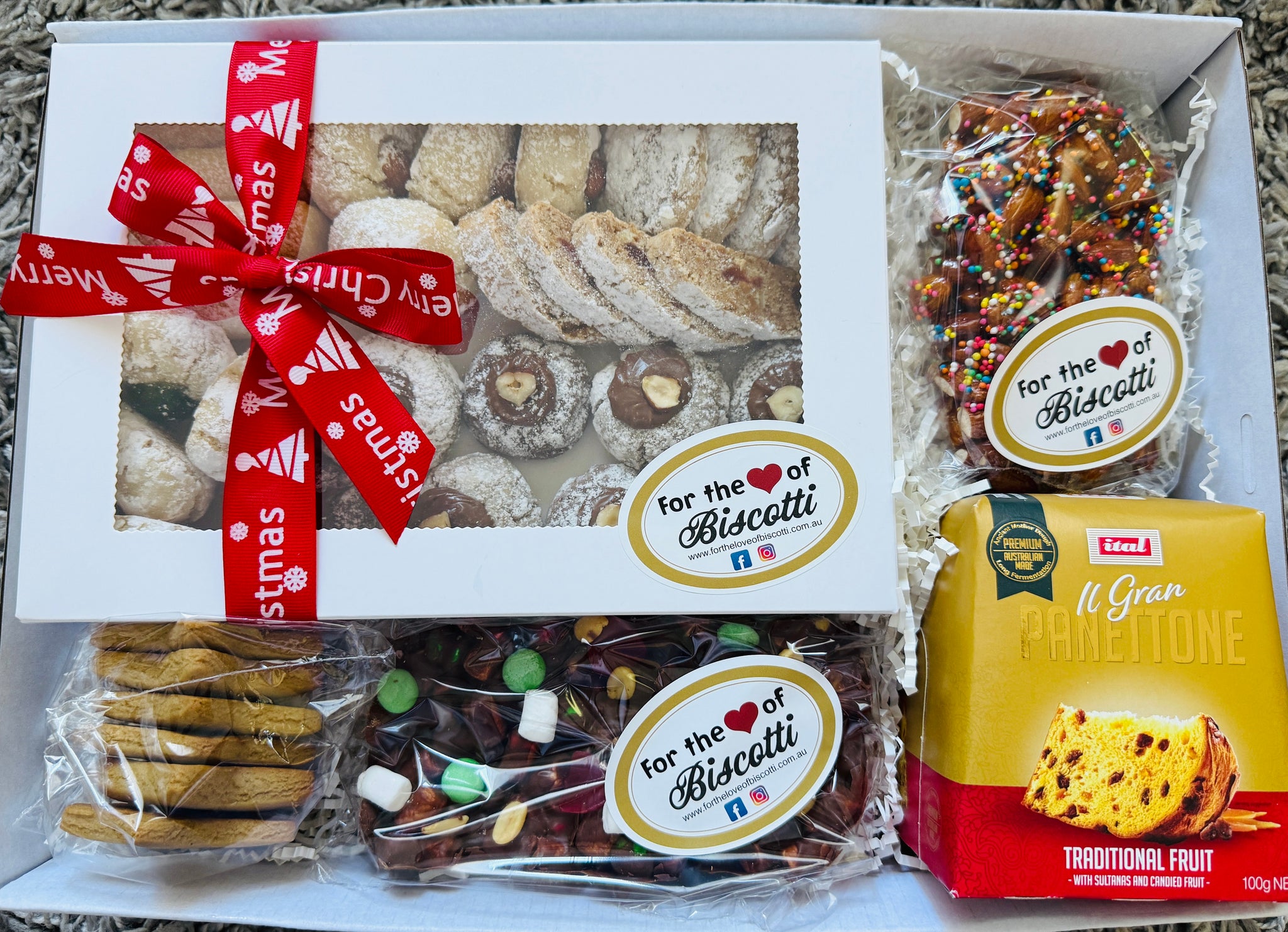 - Deluxe Christmas Hamper Box - 1 x Medium mixed box of biscotti, 1 x Christmas Rocky Road (approx 200gm), 1x Toffee Almonds (approx 150gm), 1 x 6 pack of gingerbread star biscuits, 1 x Ital mini panettone 100gm (Fruit, Orange & Choc Chip or Pear & Choc Chip (flavours will be chosen at random unless specified)