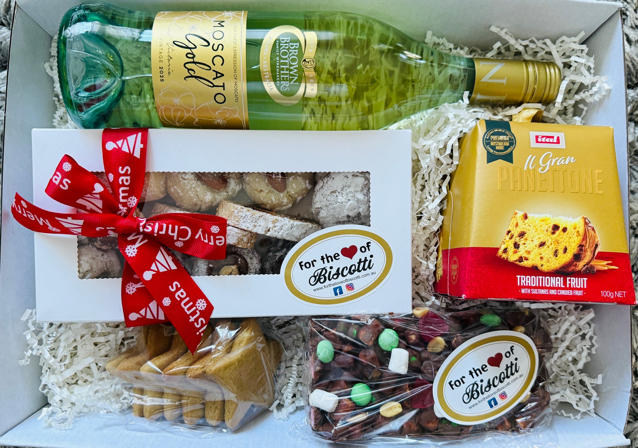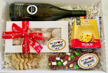 - Wine Christmas Hamper Box - 1 x Small mixed box of biscotti, 1 x Christmas Rocky Road (approx 200gm), 1 x 6 pack of gingerbread star biscuits, 1 x Ital mini panettone 100gm ((Fruit, Orange & Choc Chip or Pear & Choc Chip (flavours will be chosen at random unless specified) and your choice of Penfolds Koonunga Hill Shiraz, Brown Brothers Gold Moscato, Kim Crawford Sauvignon Blanc